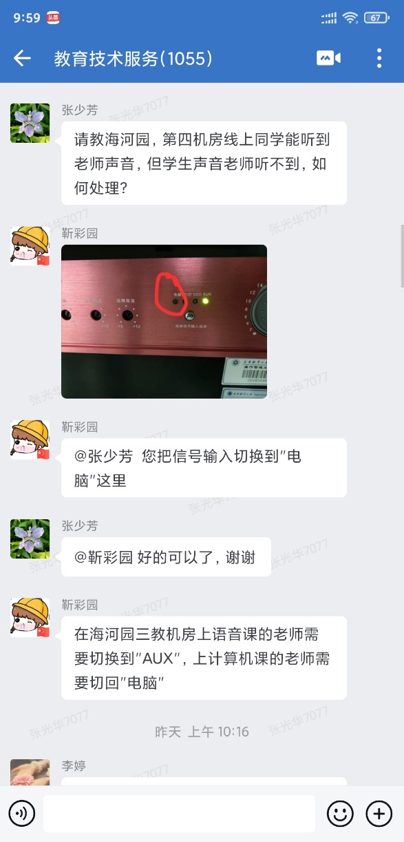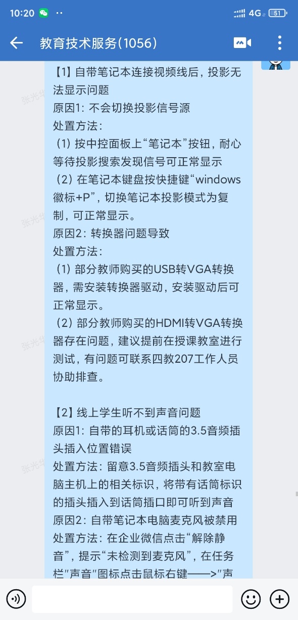 为及时解答教师在线上、线下教学实施过程中的各种问题、提高教学效果,现代教育技术中心以企业微信教育技术服务群为核心,全天候值守,及时回复解答各问题;根据主校区和海河园校区设备使用差异,主动制作多媒体设备使用视频教程,结合线上线下协同教学过程中教师遇到的各类问题总结解决办法,第一时间通过企业微信群面向教师进行推送提醒,为全校教师提供平台使用指导、软件安装、培训资源推介、远程协助、使用答疑等技术支持;及时与教务处、各学院主任、教学秘书沟通交流,了解学院线下线上教学情况,收集师生遇到的问题,第一时间对问题进行排查处理。