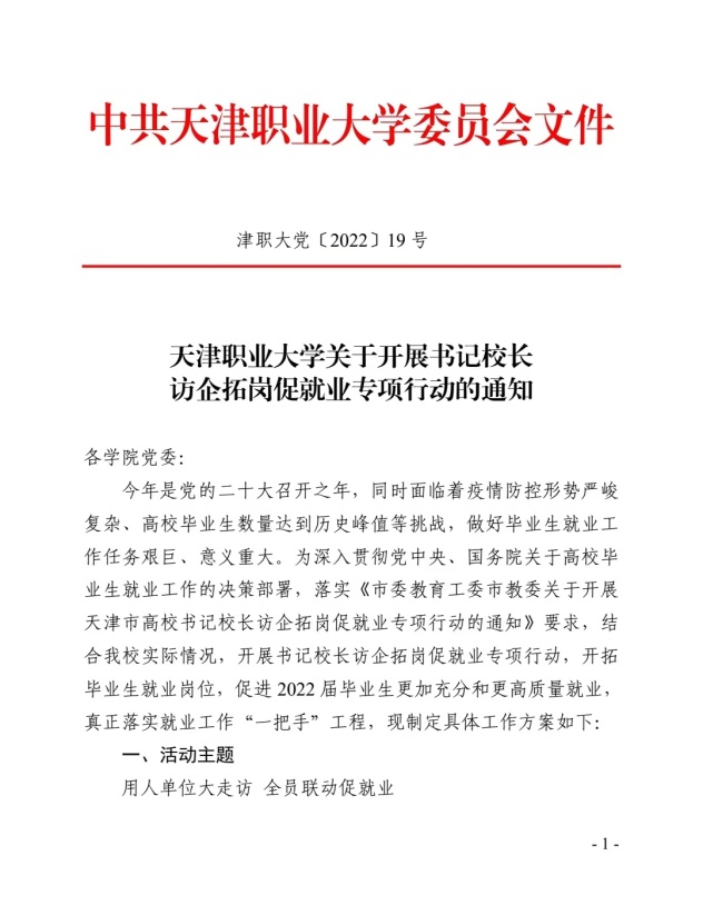为深入贯彻落实教育部办公厅《关于开展全国高校书记校长访企拓岗促就业专项行动的通知》和市委教育工委、市教委《关于开展天津市高校书记校长访企拓岗就业专项行动的通知》部署要求,beat365中文唯一官网结合“迎盛会、铸忠诚、强当担、创业绩”主题学习宣传教育实践活动内容,访企拓岗促就业专项活动全面铺开。