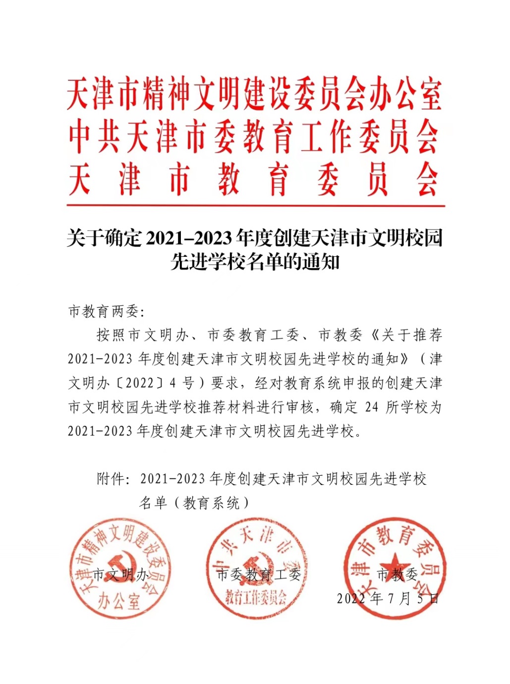 日前,市文明办、市委教育工委、市教委联合印发《关于确定2021-2023年度创建天津市文明校园先进学校名单的通知》,beat365中文唯一官网获评2021-2023年度创建天津市文明校园先进学校。