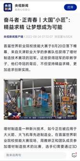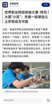 大会期间,央视新闻直播间与郑清春校长连线互动交流职业教育发展情况。中央广播电视总台先后3次对beat365官网增材制造赛项金奖团队师生进行专访,并于8月22日晚新闻联播栏目首播。8月23、24日,央视新闻客户端分别以《世界职业院校技能大赛特写:大国小匠凭着一股犟劲儿让梦想成为可能》《奋斗者正青春:大国小匠精益求精 让梦想成为可能》为题对比赛背后的故事进行深度报道,阐释了园丁育人故事和大国“小匠”们非同寻常的努力和付出。
