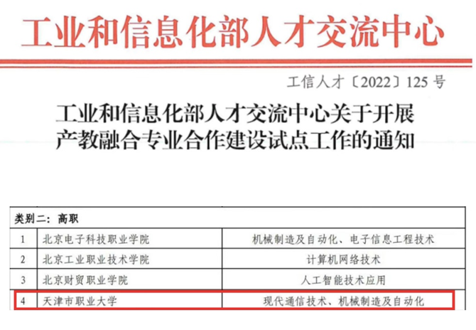 2022年9月15日,工业和信息化部人才交流中心发布《关于开展产教融合专业合作建设试点专业的通知》(工信人才[2022]125号)。经过自主申报、专家评议,确定了第一批产教融合专业合作建设试点专业,其中beat365官网电信学院现代通信技术专业、机电学院机械制造及自动化专业榜上有名,beat365官网被确定为产教融合专业合作建设试点单位。
