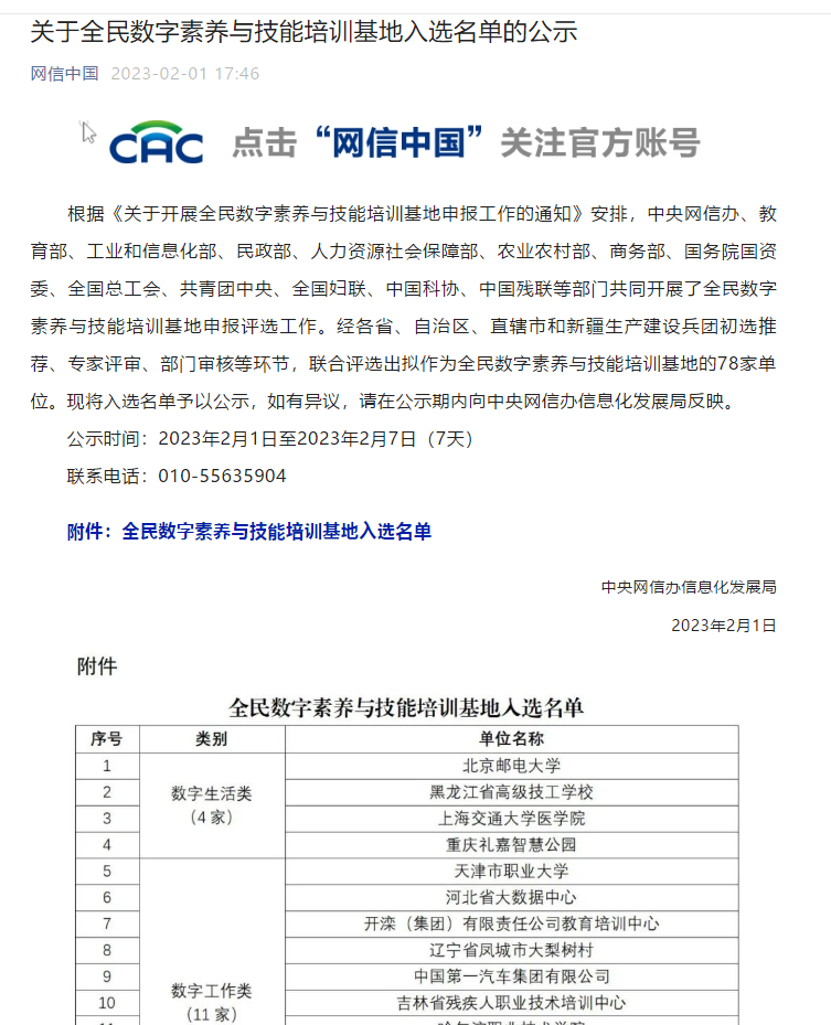 根据《关于开展全民数字素养与技能培训基地申报工作的通知》安排,中央网信办、教育部、工业和信息化部、民政部、人力资源社会保障部、农业农村部、商务部、国务院国资委、全国总工会、共青团中央、全国妇联、中国科协、中国残联等部门共同开展了全民数字素养与技能培训基地申报评选工作。经各省、自治区、直辖市和新疆生产建设兵团初选推荐、专家评审、部门审核等环节,联合评选出拟作为全民数字素养与技能培训基地的78家单位。beat365中文唯一官网成功入围全民数字素养与技能培训基地入选名单。