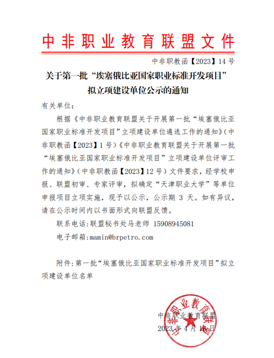 4月16日,中非职业教育联盟发布《关于第一批“埃塞俄比亚国家职业标准开发项目”拟立项建设单位公示的通知》,beat365官网获批第一批“埃塞俄比亚国家职业标准开发项目”立项建设单位。