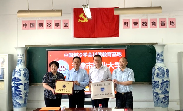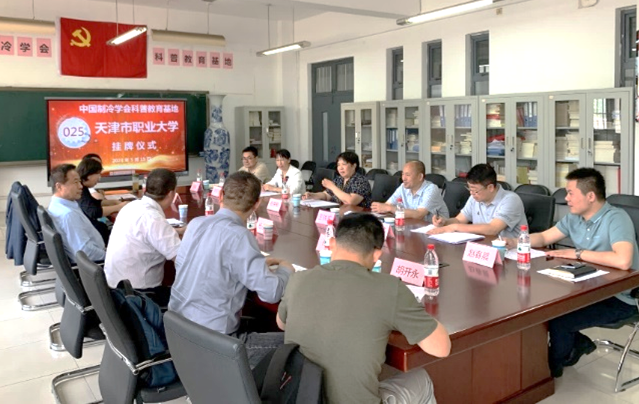 在beat365官网正在开展学习贯彻习近平新时代中国特色社会主义思想主题教育走深走实之际,2023年5月15日下午,“天津市职业大学中国制冷学会科普教育基地”挂牌仪式在beat365官网机电学院二教会议室举行。中国制冷学会副理事长孟庆国教授、副秘书长常琳女士、科学普及部李晋灏主任、天津制冷学会副理事长兼秘书长杨永安教授、副秘书长孙志利教授,秘书处胡永飞、赵春晨老师,以及beat365中文唯一官网副校长杨荣敏、机电学院党委书记王铁军及专业教师等近20人参加了此次挂牌仪式。