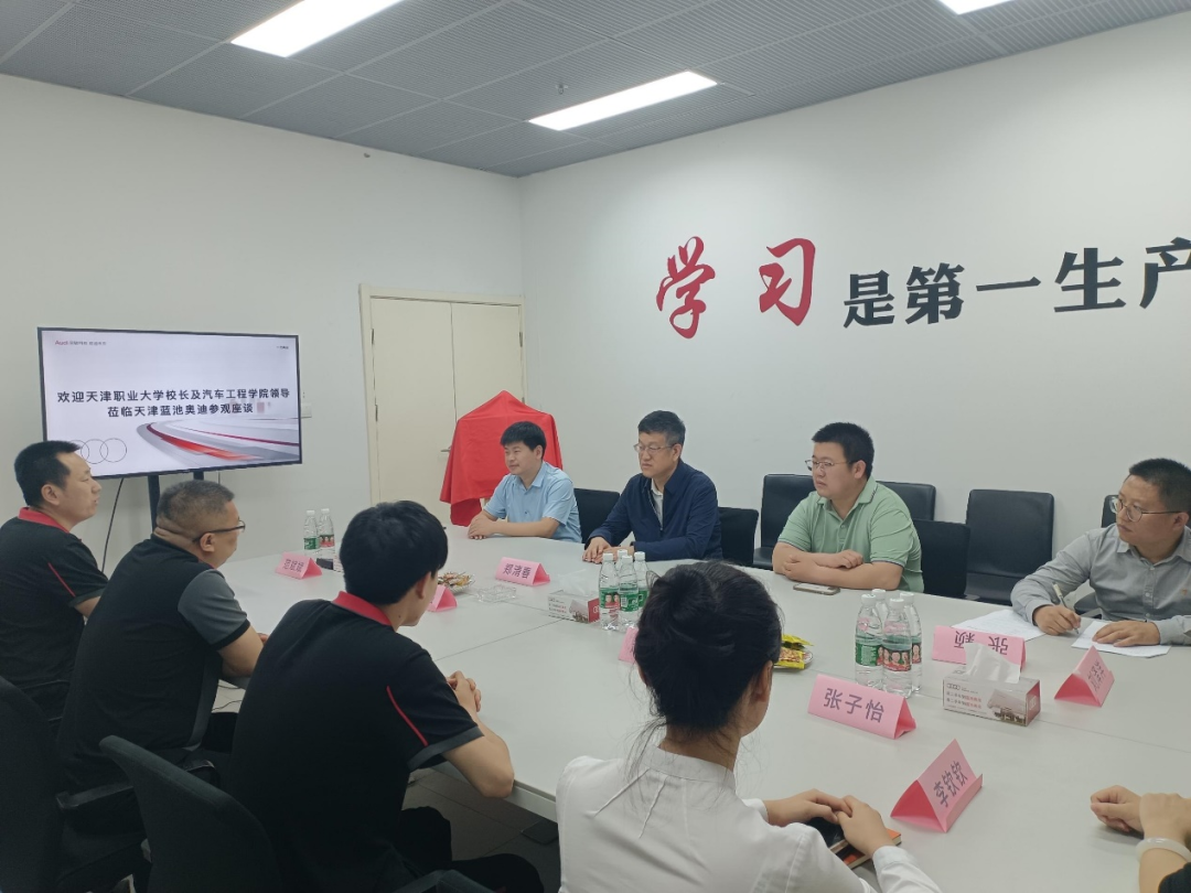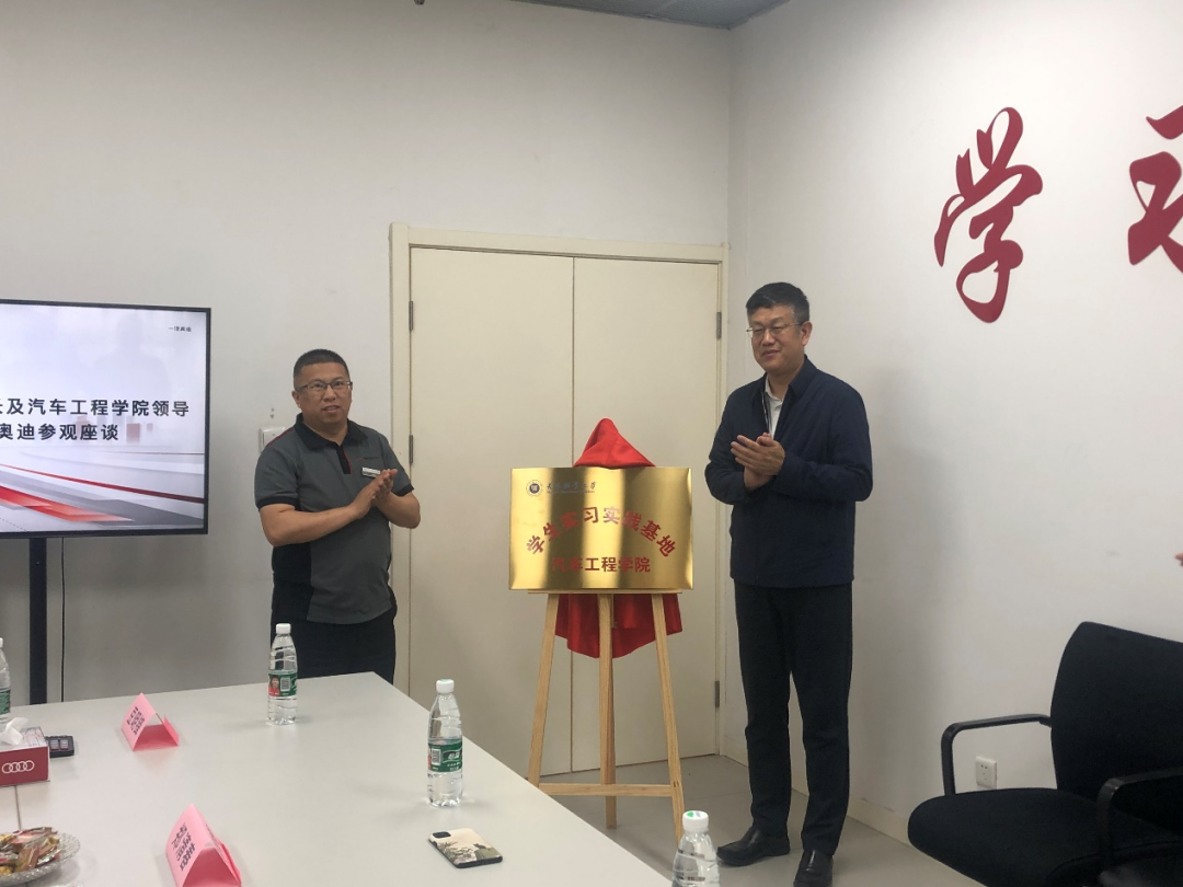 郑清春校长首先来到天津蓝池奥龙奥迪4S店,参观了企业展厅,与企业负责人、历届校友进行座谈,听取与会人员关于学校人才培养、校企合作、产教融合等方面意见建议,并为汽车工程学院学生实习实践基地进行揭牌。