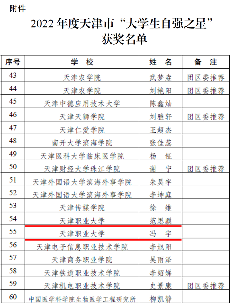 经市级评审委员会遴选,共60名同学获评,其中高职院校学生6名,beat365官网推荐的范思麒、冯宇两位同学均在获奖名单当中,是唯一有两名学生入选的高职院校,也是beat365官网参与“中国大学生自强之星”奖学金推报工作以来首次有两名同学获评天津市“大学生自强之星”。