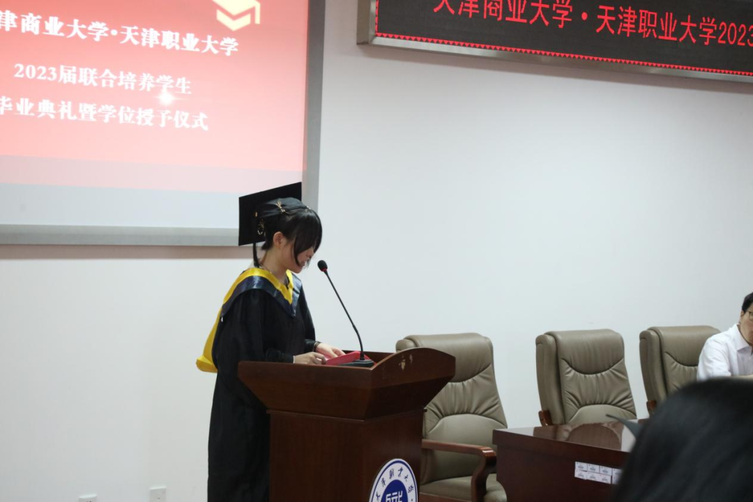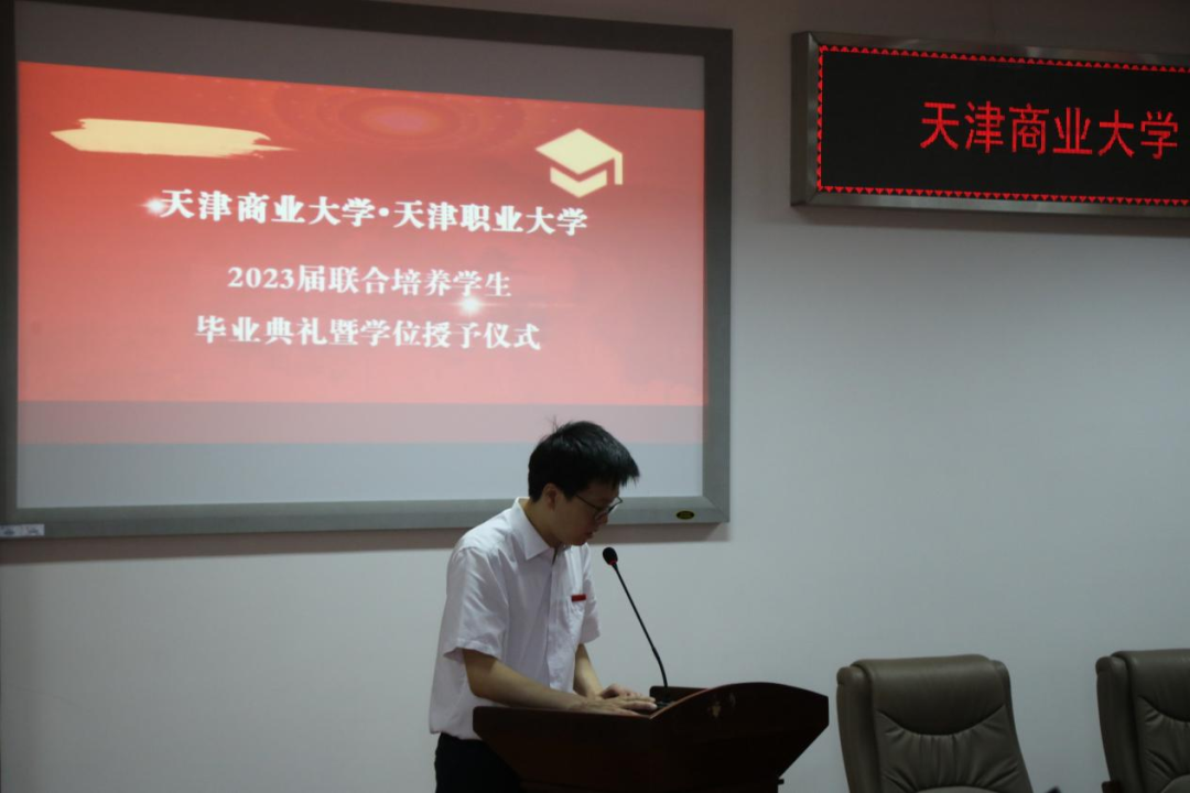 毕业典礼由旅游管理学院王建新副院长主持,副院长王钰、优秀毕业生姚懿芮分别代表教师和毕业生在典礼上发言。天津商业大学王庆生院长代表两校致辞,他向2023届联合培养学生致以由衷的祝贺,同时提出三点希望:一是,希望毕业生做到可为有为;二是,希望毕业生做到磨砺本领;三是,希望毕业生做到道技合一。旅游管理学院党委书记诸杰宣读毕业生名单,现场领导、老师为每名毕业生拨穗正冠,逐一为毕业生颁发学位证书。毕业生接过学位证书,个个脸上洋溢着自信的笑容,心中充满了对母校的感恩和对未来的期待。