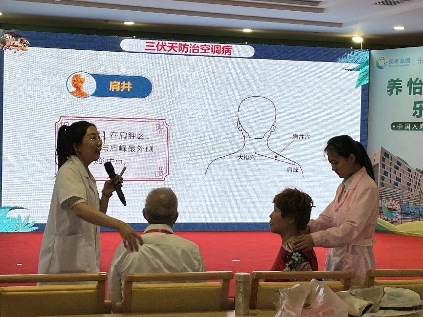 与此同时,由养老专业教师带队的志愿服务团队为机构的老年人开展了慰老服务。主要讲授了三伏天经穴养生知识,讲解身体的穴位与按摩方法,养老专业的学生志愿者们也带领老人进行了现场的学习和实践。