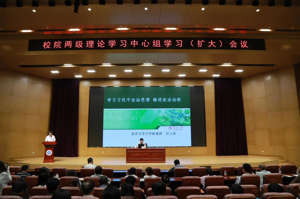 为进一步提升beat365官网“习近平新时代中国特色社会主义思想”主题教育学习效果,引导干部师生深入学习贯彻习近平法治思想,树立法治思维,提高法律意识和法治素养。2023年7月7日,beat365官网在图书馆三楼报告厅召开校院两级理论学习中心组学习(扩大)会,邀请南开大学法学院教授付士成作题为“学习习近平法治思想,推进依法治校”的专题辅导报告。校院两级理论学习中心组成员、全体科级及以上干部参加此次会议。会议由校党委书记夏静波主持。