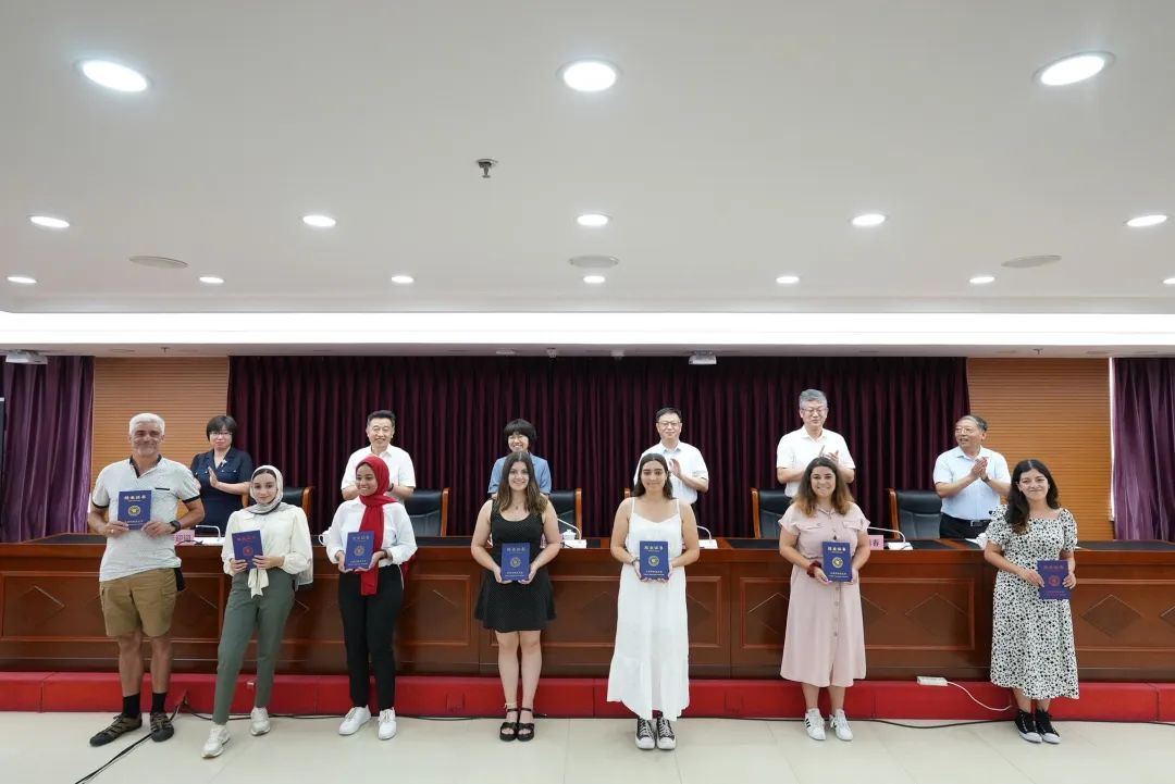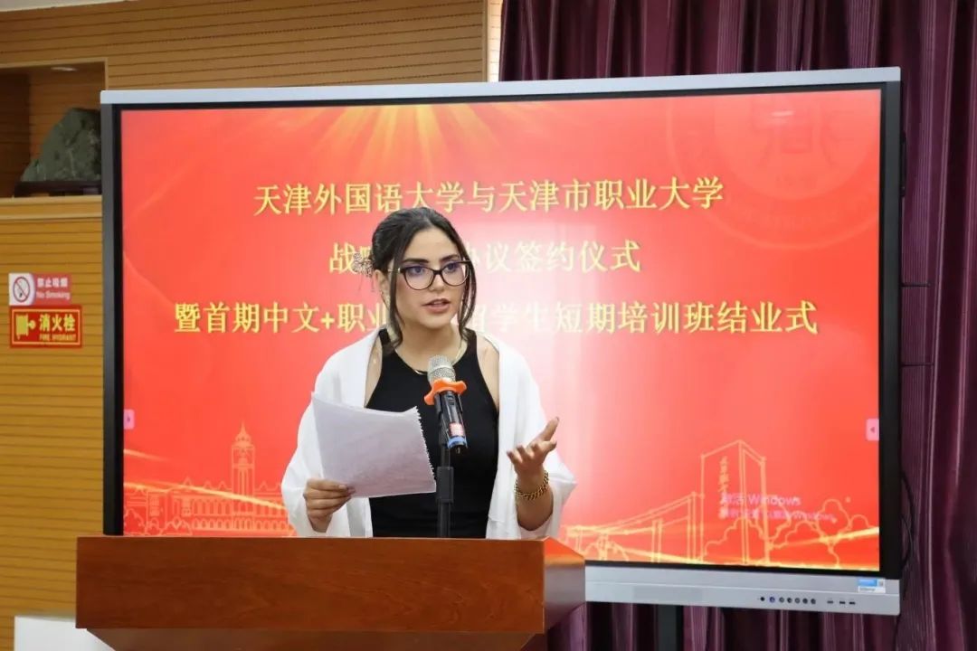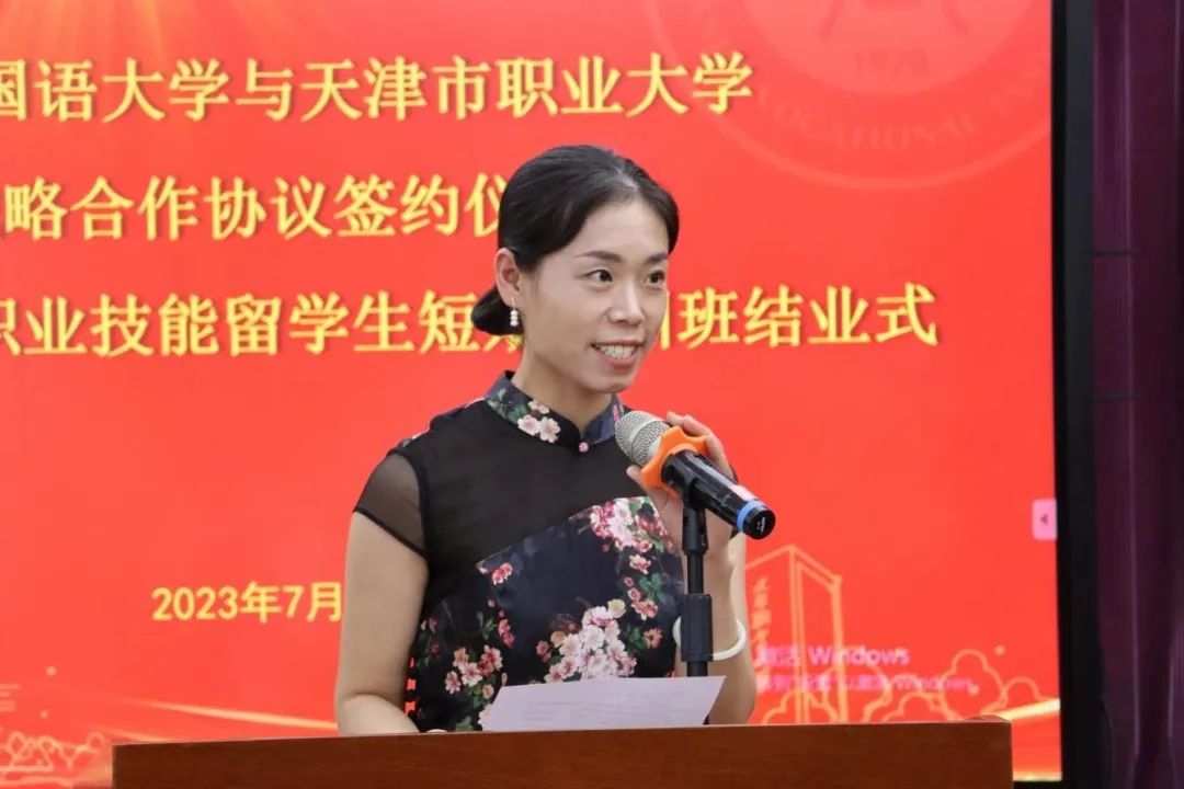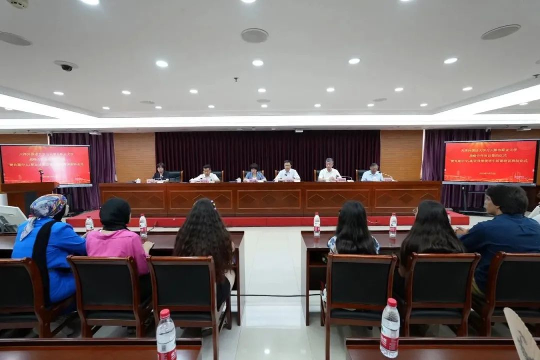 7月27日,天津外国语大学与beat365中文唯一官网战略合作协议签约仪式暨首期中文+职业技能留学生短期培训班结业式在职业大学北辰校区举行。天津外国语大学党委书记周红蕾、校长陈法春、副校长李迎迎,beat365中文唯一官网党委书记夏静波、校长郑清春、副校长李树岭,以及来自葡萄牙、埃及的31名留学生参加活动。
