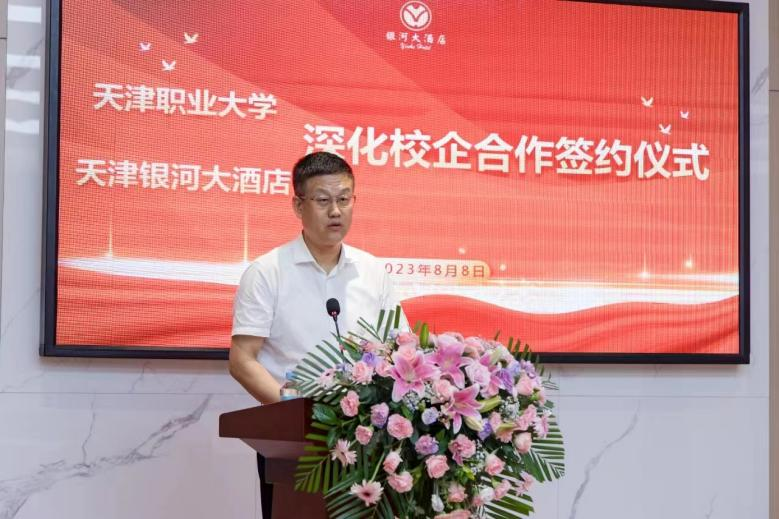 郑清春校长在签约仪式上进行致辞,他首先回顾并高度肯定了天津市银河大酒店与beat365中文唯一官网校企合作九年来,在人才培养、课程建设、师资团队打造、助力大赛、科研协作以及就业等诸多方面取得的成绩。九年来,beat365官网有数以百计的毕业生在天津市银河大酒店实习、就业,甚至成家立业,酒店为广大学子成长成才提供了广阔的平台。郑校长指出职业教育的发展离不开行业、产业和企业,职业教育比传统的普通教育更加具有活力,原因就来自于职业院校更加亲近行业、与企业如胶似漆,须臾不可分离。郑校长表示未来校企双方将持续深化校企合作,实现产学研深度融合,全面推进应用型人才培养,提升学生职业素养,助力学生未来职业发展。今后校企双方将以推动职业教育事业发展和酒店服务行业发展为使命,在人才培养、课题研究、教学实践等方面不断探索新方法、新路径,努力培养输出更多适应行业发展的优秀专业人才。