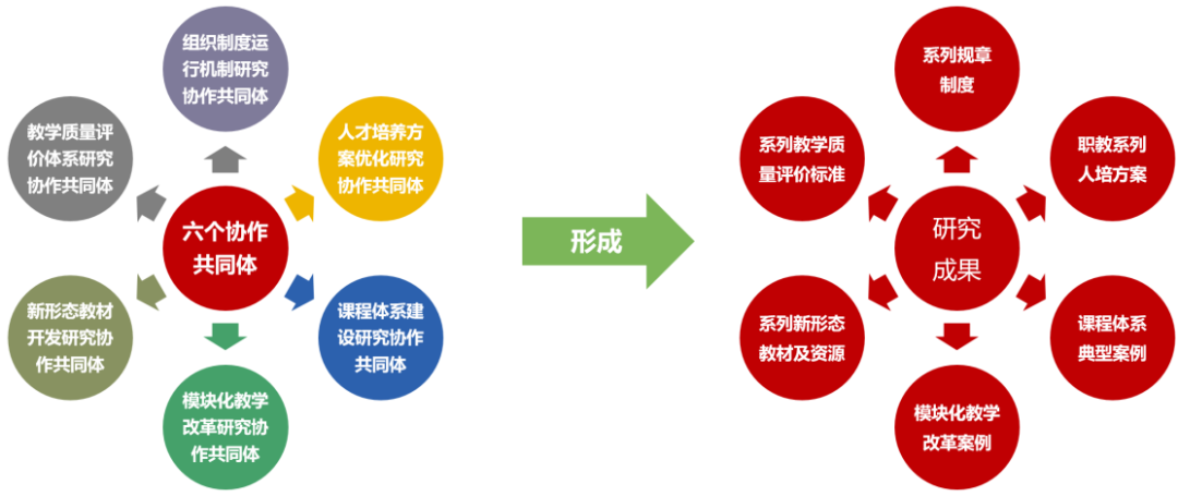 课题组按照 《国家职业教育改革实施方案》中组建高水平、结构化教师教学创新团队的要求,依托飞书任务协作平台组成多个 “微共同体”,即若干基于专业领域价值认同的聚优共研校际共同体、基于模块教学需要的教学共同体(主要为校内专兼教师组合)和基于创新发展融合共生的校企共同体。beat365中文唯一官网统筹规划、科学管理、系统推进七个研究任务,包括:创新团队协作共同体建设、创新团队建设的组织制度和运行机制、人才培养方案、对接职业标准的课程体系、团队协作的模块化教学模式和方法新形态教材开发、创新团队教学质量评价体系。