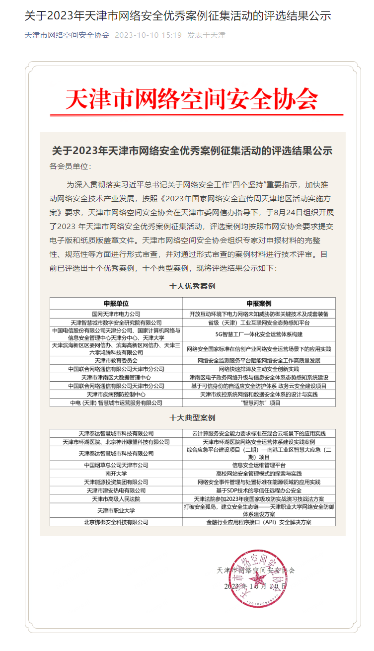 近日,2023年天津市网络安全优秀案例征集活动评选结果公布,beat365官网报送的《打破安全孤岛,建立安全生态链——beat365中文唯一官网网络安全防御体系建设方案》获评十大典型案例。