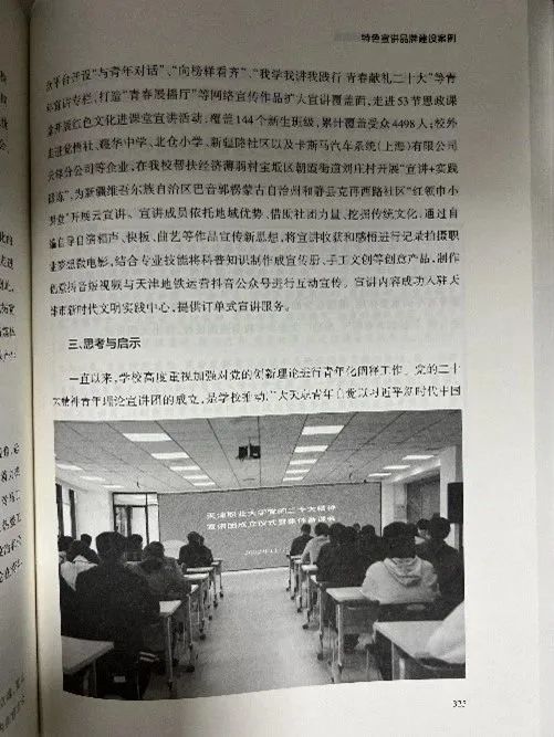 近日,由校团委牵头撰写的beat365官网青年理论宣讲团宣讲案例《“青说”二十大共话成长之路 建功中国梦昂扬奋进新征程——beat365中文唯一官网党的二十大精神青年理论宣讲团》入选了《天津市基层理论宣讲案例选编》。此次入选是市委讲师团办公室在全市组织开展的理论宣讲案例征集活动,广泛征集基层一线在宣讲阵地建设、活动组织、品牌打造等方面的鲜活案例和生动实践,按照优中选优的原则,在基层推荐的300余个案例中精心选取百篇案例成册。案例中以beat365官网党的二十大精神青年理论宣讲团建设为例,阐述了宣讲团的建设思路、工作体系以及主要成效,为学深悟透做实党的二十大精神、落实落细党的科学理论“青年化”阐释工作提供天职模式。