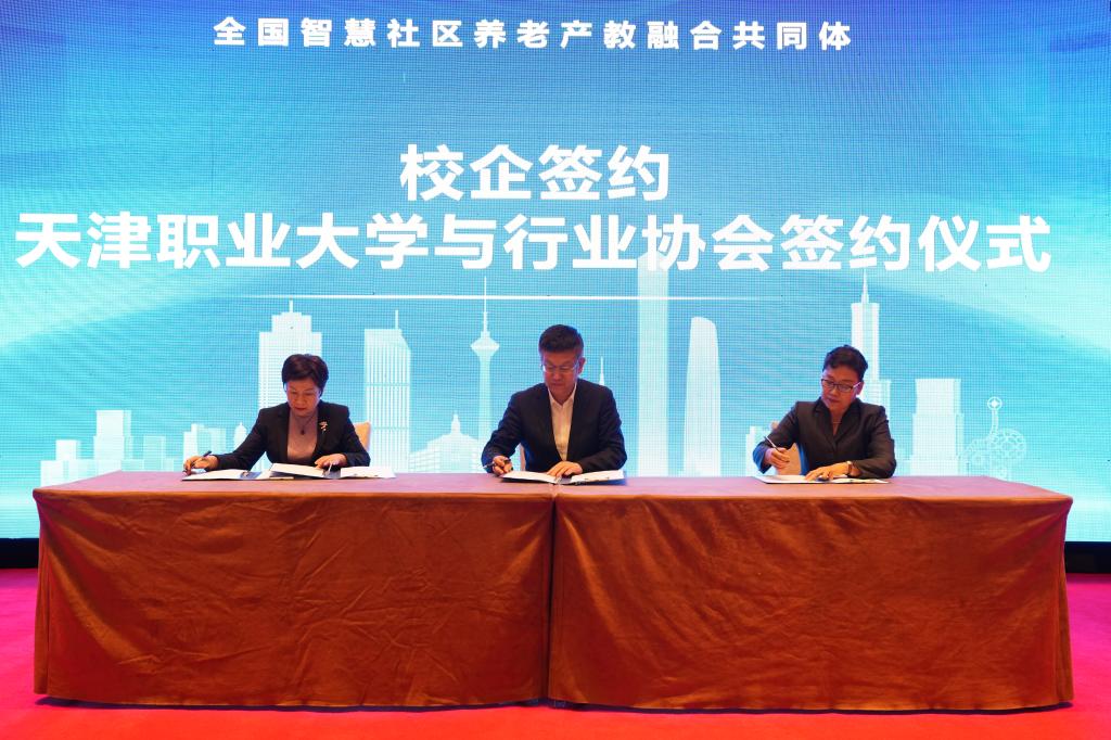 大会现场,举办了全国智慧社区养老产教融合共同体启动仪式。天津市民政局二级巡视员张宝甫、天津市教委职教处处长李力、beat365中文唯一官网校长郑清春、天津津旅泊泰投资发展有限公司董事长席军分别发表致辞、讲话。beat365中文唯一官网公共管理学院院长王昆汇报全国智慧社区养老产教融合共同体筹备工作情况,beat365中文唯一官网与国中康健华录健康养老发展有限公司、泰康健康产业投资控股有限公司、中国老龄产业协会、天津市老龄产业协会签署合作协议。