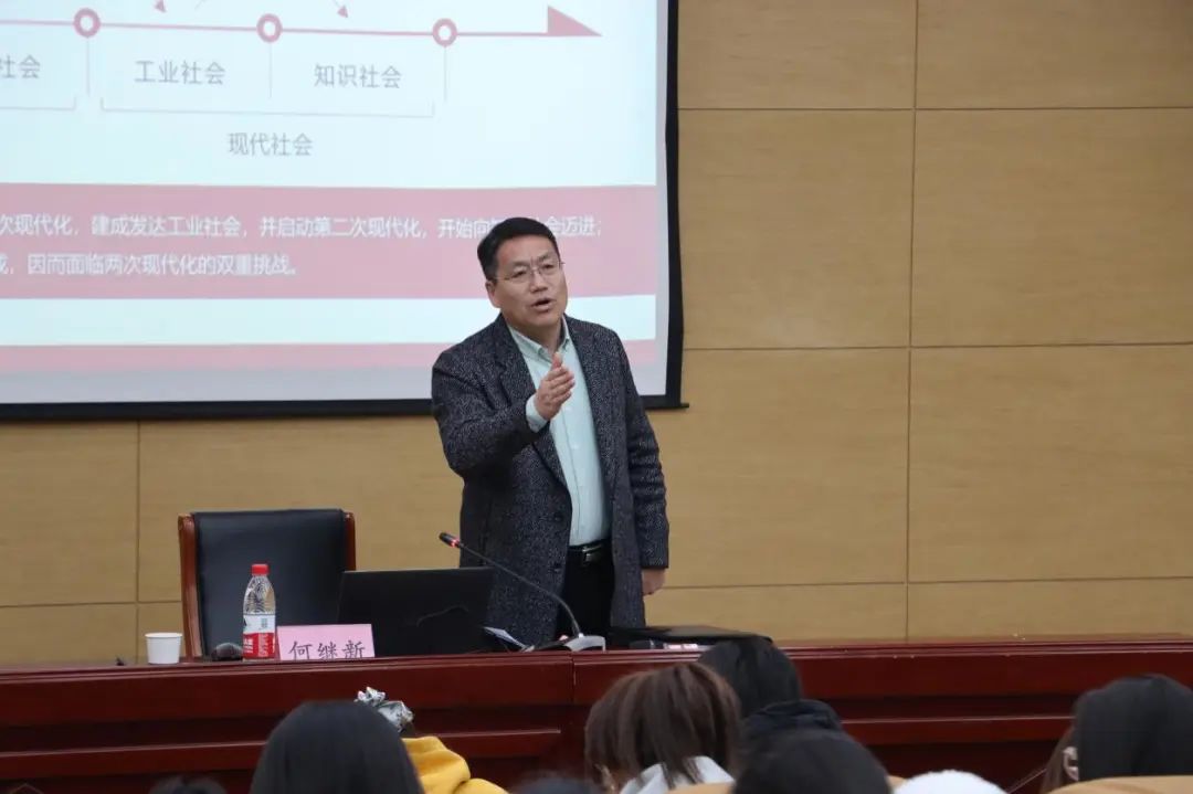 何继新教授从“中国式现代化历史发展演进”“中国式现代化的五个特征”“中国式现代化的本质”“中国式现代化面临问题”四个方面进行讲授。何教授指出,中国式现代化是一项史无前例的伟大工程,是我们党领导全国各族人民在长期探索和实践中历经千辛万苦、付出巨大代价取得的重大成果,我们必须倍加珍惜、始终坚持、不懈拓展和深化。何教授细数自己的过往经历与见闻,从改革开放到读研期间见证神舟五号飞船的起飞,从中国共产党战胜“非典”,到2008年的北京奥运会,再到神舟十七号载人飞船发射成功,他将自己的成长经历与国家的发展紧密结合,用自己的亲身感受诉说党带领人民探索中国特色社会主义发展之路的历史。最后,何教授指出当代青年何其有幸,成为中国从富起来到强起来的亲历者、见证者和受益者,表达了对学生们的满满期望。