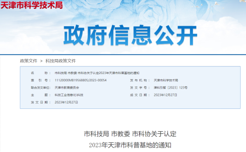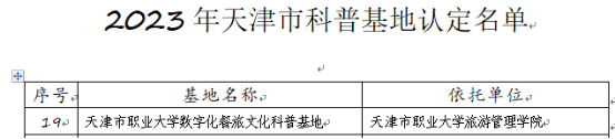 2023年12月27日,天津市科学技术局、天津市教育委员会、天津市科学技术协会发布了关于认定2023年天津市科普基地的通知,市科技局、市教委、市科协对本年度140家申报单位进行了严格的评估和审核,最终认定58家单位为2023年天津市科普基地。旅游管理学院天职数字化餐旅文化科普基地成功获批。