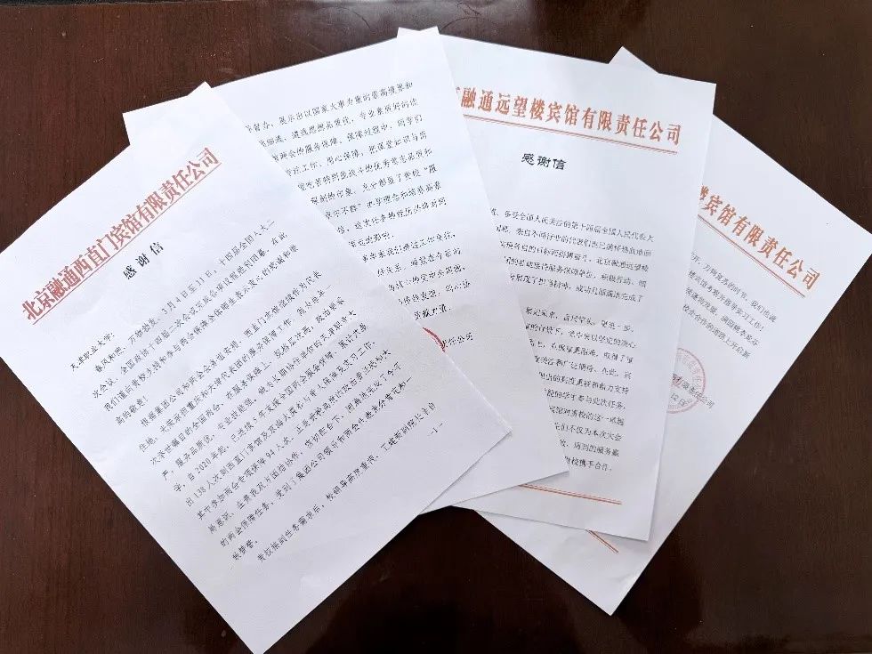层层选拔而出的旅游管理学院学生,以其热情、细致、周到的服务及良好个人素质,赢得了来自天津、重庆、安徽、宁夏参会人员的高度好评。大会接待结束后,十四届全国人大二次会议北京融通西直门宾馆驻地接待组向学校送来锦旗,驻地接待组融通远望楼酒店发来感谢信,感谢beat365官网学生在全国两会期间的担当作为,对beat365官网培养出具有良好专业技能、职业素养、工匠精神的优秀人才表示感谢,并表达了与beat365官网进一步加强校企合作、携手共进的期盼。