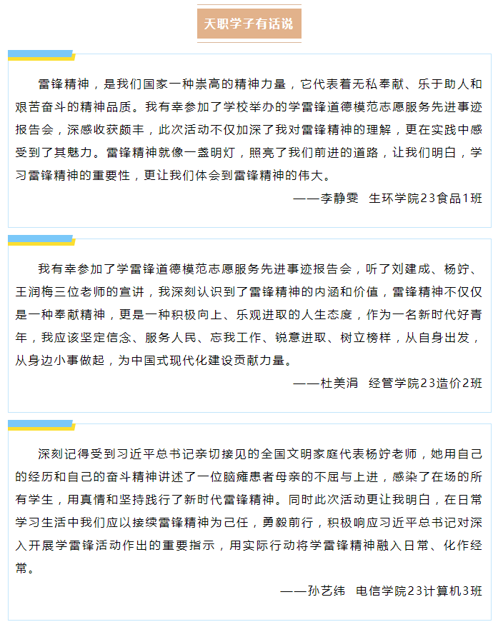 一支常态化传承与弘扬雷锋精神的团队;一群信念坚定、大爱忘我、积极进取的时代楷模;一批忠实践行雷锋精神的志愿服务队伍,他们不畏严寒酷暑,风雨无阻、坚持不懈,一段段感人至深的故事 ,一刻刻暖心至极的瞬间,令在场师生受益匪浅。巡讲团成员在弘扬雷锋精神、传递志愿精神的同时,也让大家感受到劳模精神、劳动精神、工匠精神的可贵,深刻理解劳动光荣、技能宝贵、创造伟大,用甘于奉献在平凡中做出不平凡。他们还充分肯定了天职学子积极向上、昂扬奋发的良好精神风貌,鼓励大家学好知识本领提升职业素养,坚定技能报国的理想信念。在今后工作中,beat365官网共青团将继续推进学雷锋志愿服务常态化、制度化,引导和激励更多的同学参与到学雷锋志愿服务中来,携手将雷锋精神转化为实际行动,把雷锋精神播撒在校园,营造学雷锋、争先锋的良好氛围,为建设“志愿之城”贡献天职力量。(来源:校团委)