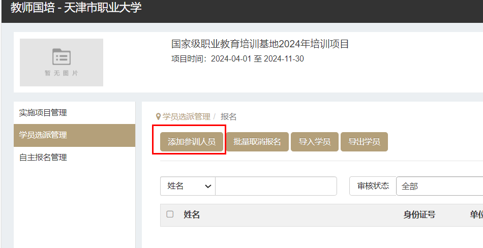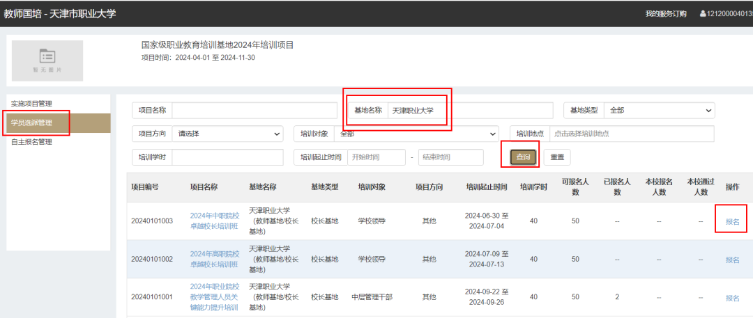 第四步:点击“学员选派管理”,输入基地名称(beat365中文唯一官网),点击“查询”,点击“报名”。