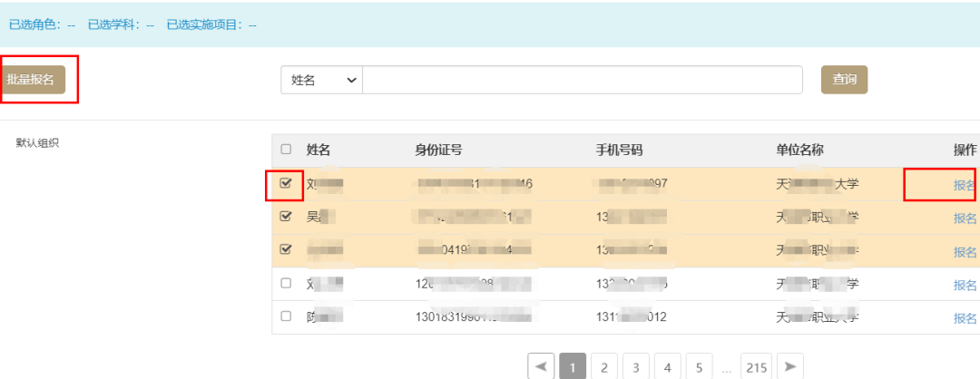 第六步:选中单个学员,点击右侧的“报名”;或选中多个学员,点击左侧的“批量报名”。
