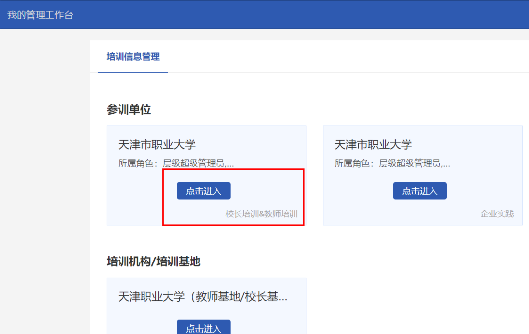 第二步:进入“我的管理工作台”,从“参训单位”端口进入。