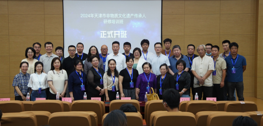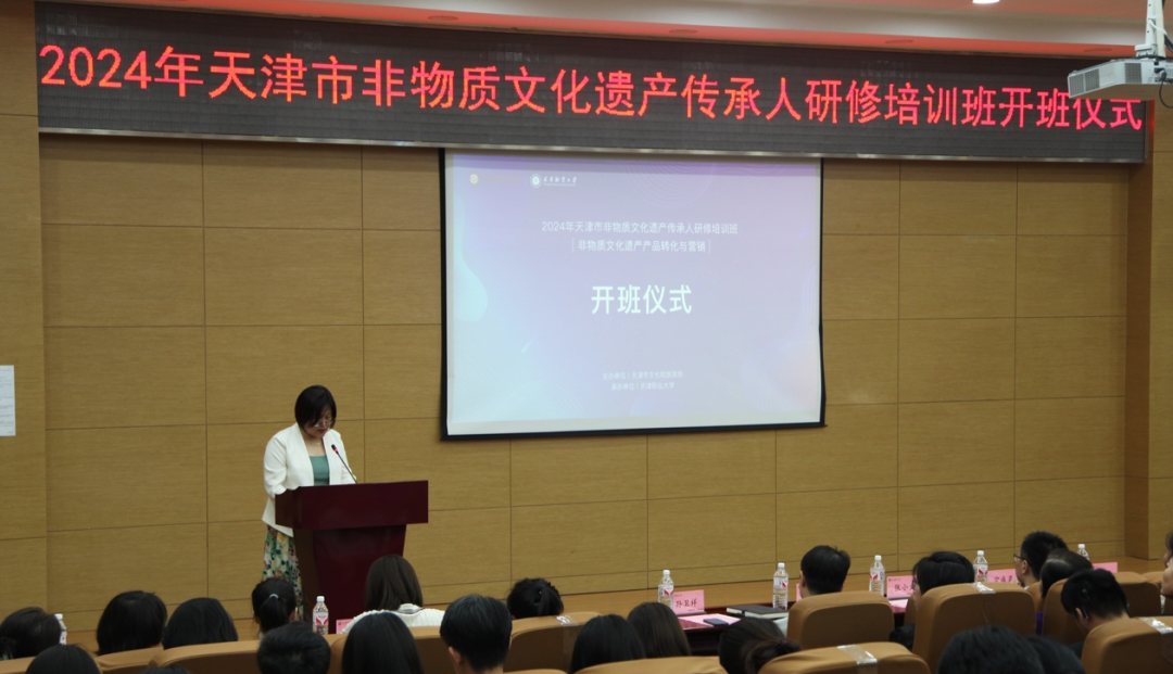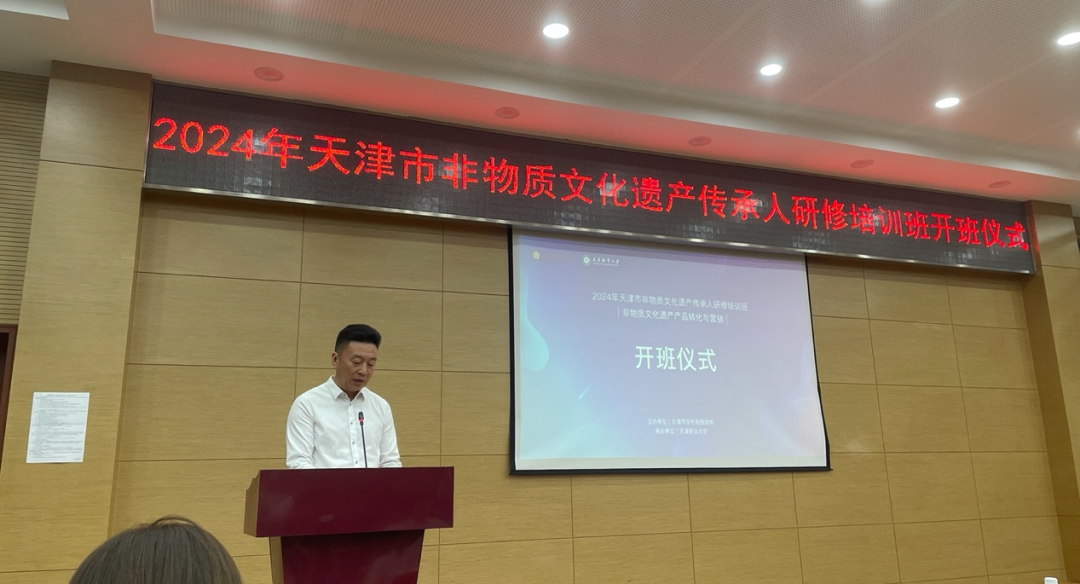 2024年6月25日上午10点,由天津市文化和旅游局主办、beat365中文唯一官网承办的“2024年天津市非物质文化遗产传承人(非物质文化遗产产品转化与营销)研修班”,于beat365中文唯一官网北辰校区正式开班。beat365中文唯一官网校长吴宗保、天津市文化和旅游局非遗处处长宗成灵、天津市非遗中心主任钱玲、beat365中文唯一官网继续教育中心主任张荃、艺术工程学院院长张小文及学院其他领导和本次非遗研修班的全体学员参加开班仪式。
