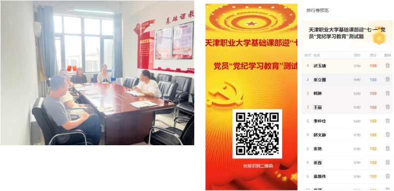 基础课部党总支开展党纪学习教育答题活动和主题征文活动,加强党员教师对党纪党规的理解和掌握,增强纪律意识和规矩意识;举办新教师座谈会,加强与新教师的交流与沟通,提升教师的职业素养和教育教学能力;组织师德师风培训,进一步明确新时代高校教师应具备的政治素养和职业操守。