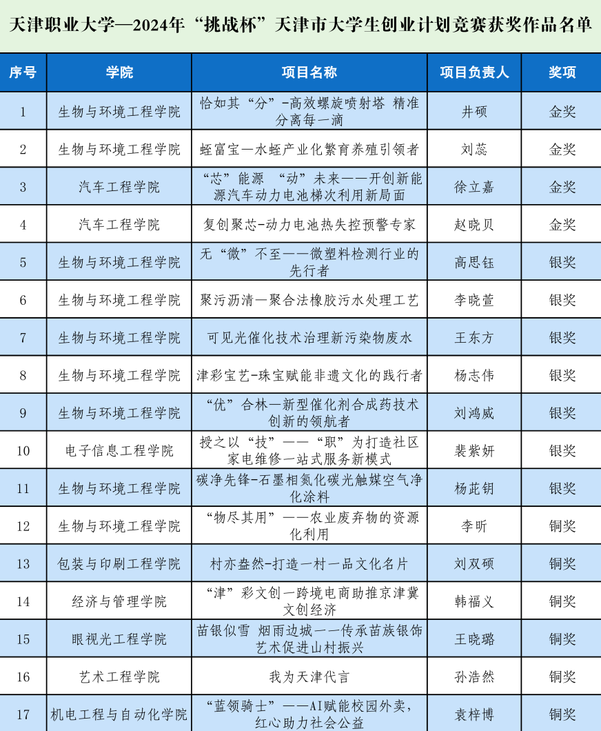 近日,共青团天津市委员会下发《关于2024年“挑战杯”中国银行天津市大学生创业计划竞赛结果的通报》,beat365官网入围市赛的18个项目通过市赛网评、终审决赛等环节,最终获得金奖4项、银奖7项、铜奖6项,获奖总数超过上届取得突破,获奖总数和金奖项目均位列高职院校第一,同时获得天津市“优胜杯”和“优秀组织单位”称号。生环学院报送的《蛭富宝—水蛭产业化繁育养殖引领者》、《恰如其“分”-高效螺旋喷射塔 精准分离每一滴》项目、汽车学院报送的《复创聚芯-动力电池热失控预警专家》项目顺利推荐至国赛网评阶段。