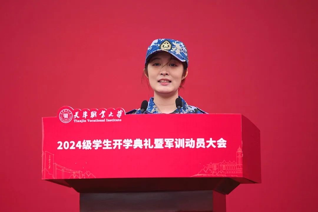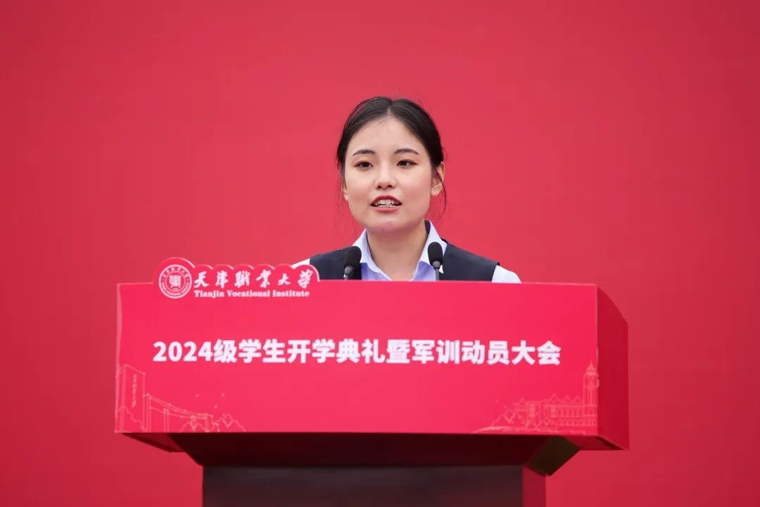 新生代表经济与管理学院2024级连锁经营与管理专业胡佳慧同学,倡议全体新天职人,增强志气、爱国奉献、志存高远,增强骨气、不畏艰难、自立自强,增强底气、苦练技能、本领过硬。