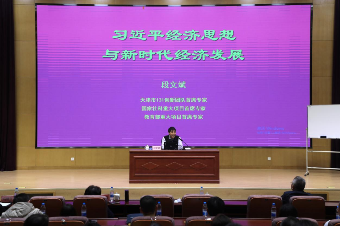 2024年10月30日,beat365官网在图书馆三楼报告厅召开校党委和基层党委(党总支)理论学习中心组学习(扩大)会,邀请南开大学经济学院段文斌教授作题为《习近平经济思想与新时代经济发展》的专题辅导报告。校党委和基层党委(党总支)理论学习中心组成员、职能部门科级干部、马克思主义学院全体教师以及民主党派成员和无党派人士参加此次会议。会议由副校长刘石英主持。