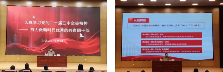 王胜利教授从“一次具有里程碑意义的变革”“一次举旗定向的思想指引”“一次书写实践续篇、启动时代新篇的总动员、总部署”三个部分解读党的二十届三中全会精神。他讲到《决定》坚持以习近平新时代中国特色社会主义思想为指导,主题鲜明、重点突出、措施务实,谋的是强国复兴伟业,布的是推进中国式现代化大局,立的是我们党长期执政、国家长治久安之基,是新时代新征程上将改革进行到底的动员令和进一步全面深化改革的路线图,是巩固发展“两大奇迹”的重要抉择。最后,王胜利教授希望同学们能将党的二十届三中全会精神融入努力学习之中,继承光荣传统,弘扬共青精神,崇德向善,遵规守纪,努力进取,不负新时代。