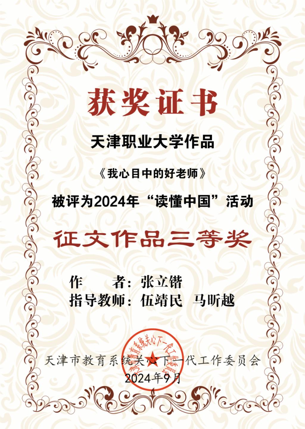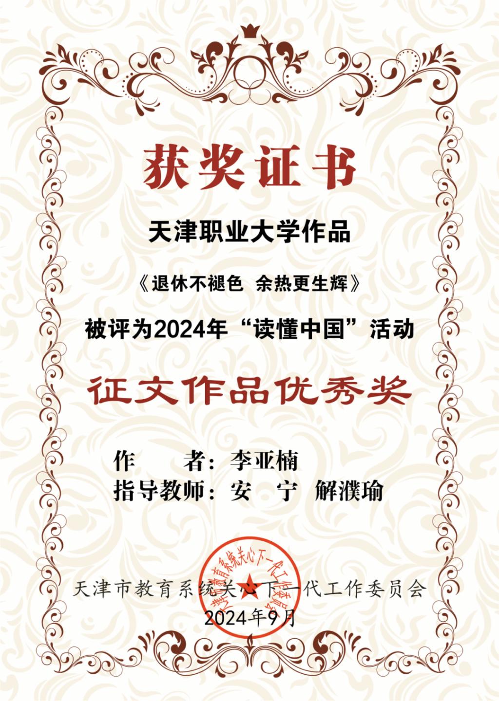 近日,天津市教育系统关工委下发了《关于公布了2024年“读懂中国”优秀作品评审结果的通知》,beat365官网关工委报送的《我心目中的好老师》征文作品获得三等奖,《退休不褪色 余热更生辉》征文作品获得优秀奖。
