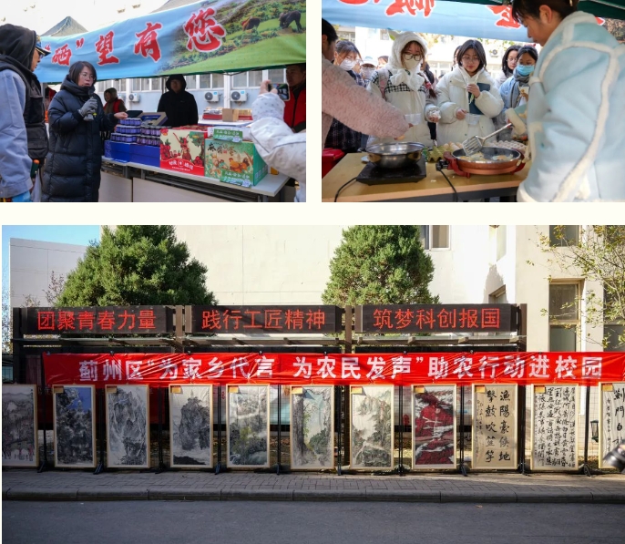 此次展销会分为“农品推介、美食品鉴、为家乡代言”三个展区,提供产自蓟州当地50余种特色农副产品,同时准备各种水果蔬菜、特色食物供师生选购,为师生带来绿色健康、放心安全、味美质优的农特产品。在农品推介展区,各摊位师生络绎不绝,师生精心挑选心仪产品;在美食品鉴展区,通过现场制作美食供师生试吃,让师生了解农产品的口感、品质等方面的特点,从而喜欢蓟州特色美食;在家乡代言展区,通过一幅幅书画作品和文创作品,充分展示了蓟州区秀美景色。