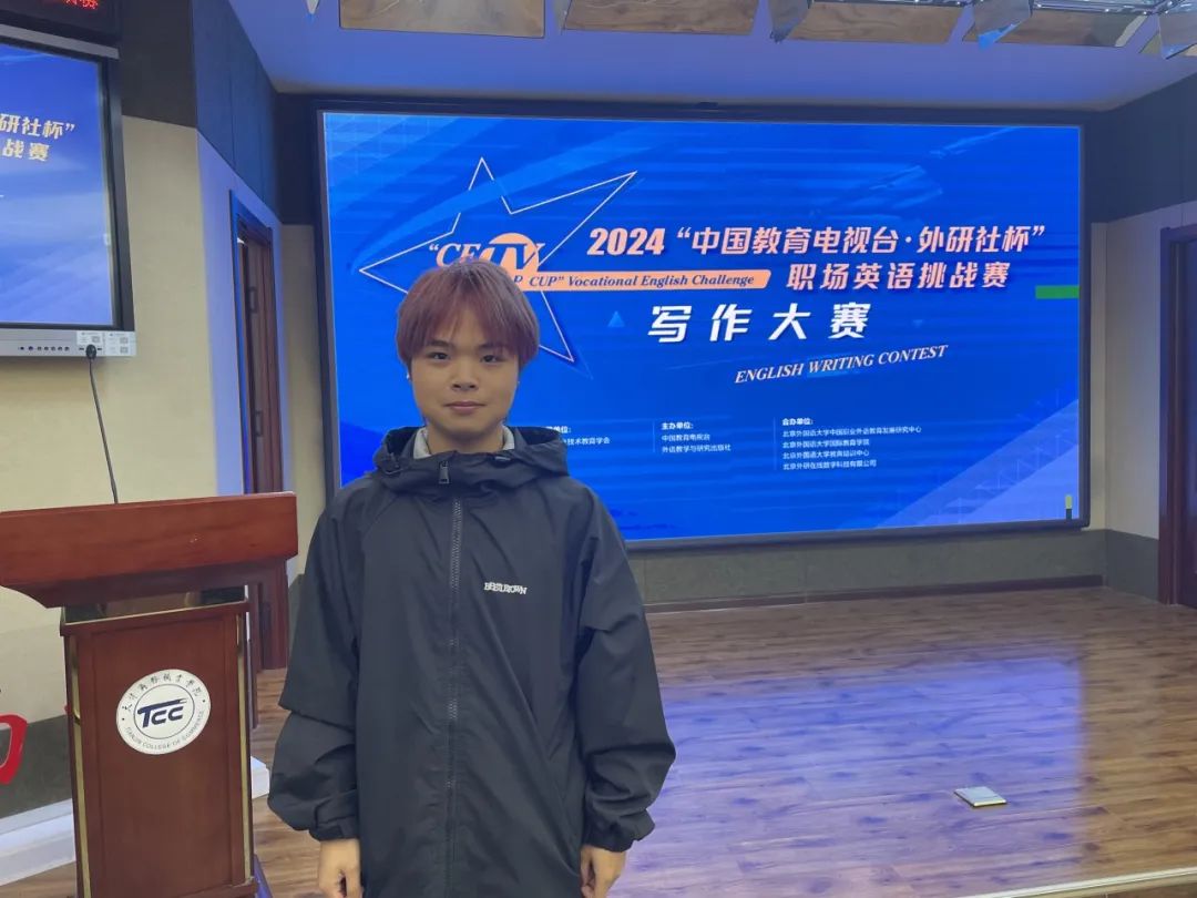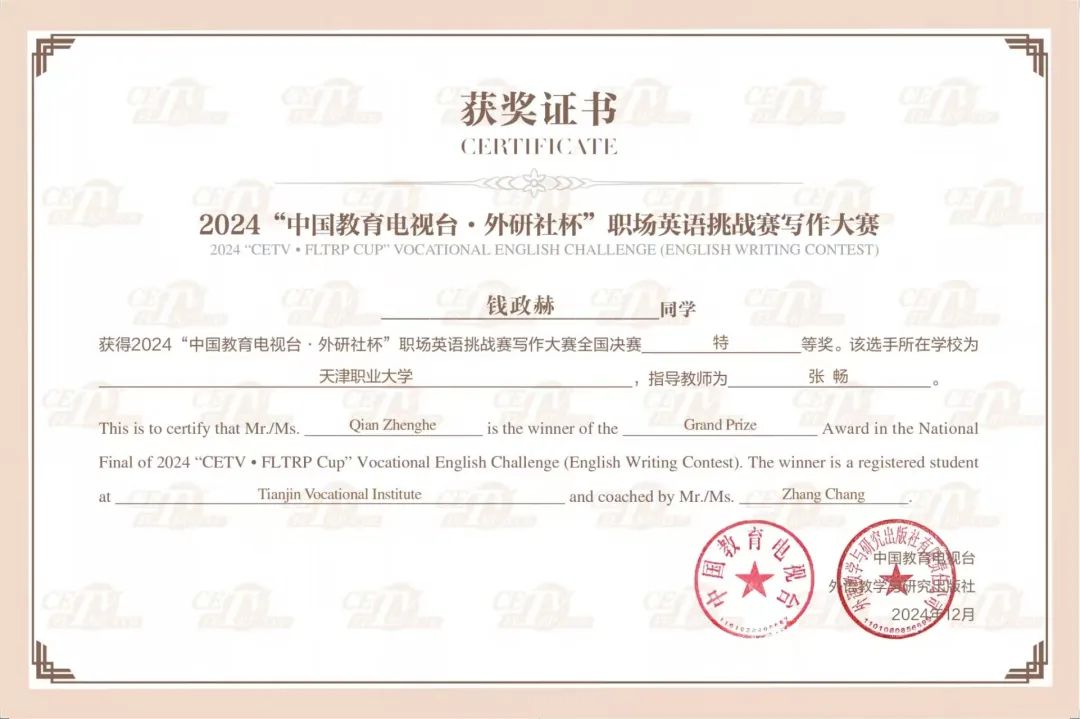 12月8日,2024“中国教育电视台·外研社杯”职场英语挑战赛写作大赛全国决赛云端成功举办。来自全国28个省、自治区、直辖市的90名优秀职教学子,以笔为锋,尽展文思,最终决出全国特等奖10名,全国一等奖15名,全国二等奖25名,全国三等奖39名。beat365官网23级广告3班钱政赫同学表现优异,荣获写作大赛全国特等奖、天津市特等奖,创造近年最好成绩。