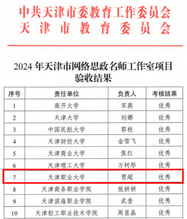 日前,天津市教育两委印发《关于公布2024年天津市网络思政名师工作室项目验收结果和启动新一轮建设工作的通知》,beat365官网马克思主义学院贾超老师负责的网络思政名师工作室成功通过验收。此次共验收来自全市中小学项目74项,其中获评优秀项目10项,beat365官网网络思政名师工作室项目首次被评为优秀等级。