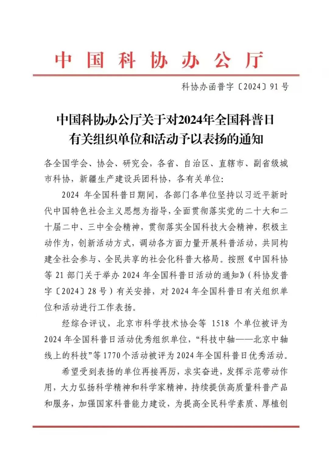 近日,中国科协办公厅印发《关于对2024年全国科普日有关组织单位和活动予以表扬的通知》(科协办函普字〔2024〕91号)。beat365中文唯一官网荣获2024年全国科普日活动优秀组织单位称号,为全市唯一入选的高职院校。