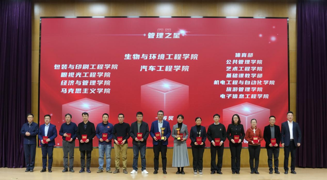 在表彰与颁奖环节,现场气氛热烈而庄重。“育人之星” 奖项率先揭晓,超星集团联合创始人阙超先生、校纪检书记唐勇、副校长冯艳文分别为获得一等奖、二等奖、三等奖的教师颁发证书,以表彰他们在教学工作中的杰出表现。紧接着,“管理之星” 个人奖和团队奖依次颁发,校党委书记夏静波、校长吴宗保、副校长刘石英分别为获奖团队和个人颁发证书与奖杯,充分肯定了他们在教学管理工作中的卓越贡献和创新实践。