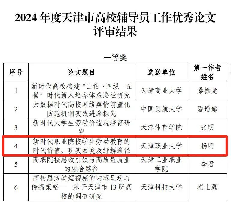 为进一步学习贯彻党的二十大和二十届二中、三中全会精神,深入学习贯彻习近平总书记在全国教育大会上的重要讲话精神,推进《全面加强新时代高校辅导员队伍建设行动方案》落地见效,推动我市高校辅导员加强工作研究、总结工作经验、提炼工作成果、提升工作质量,市教育两委开展了2024年度天津市高校辅导员工作优秀论文征集活动,beat365官网学工部杨明老师喜获一等奖。