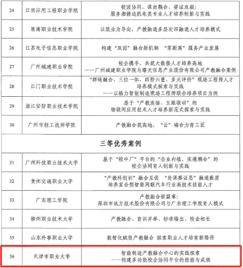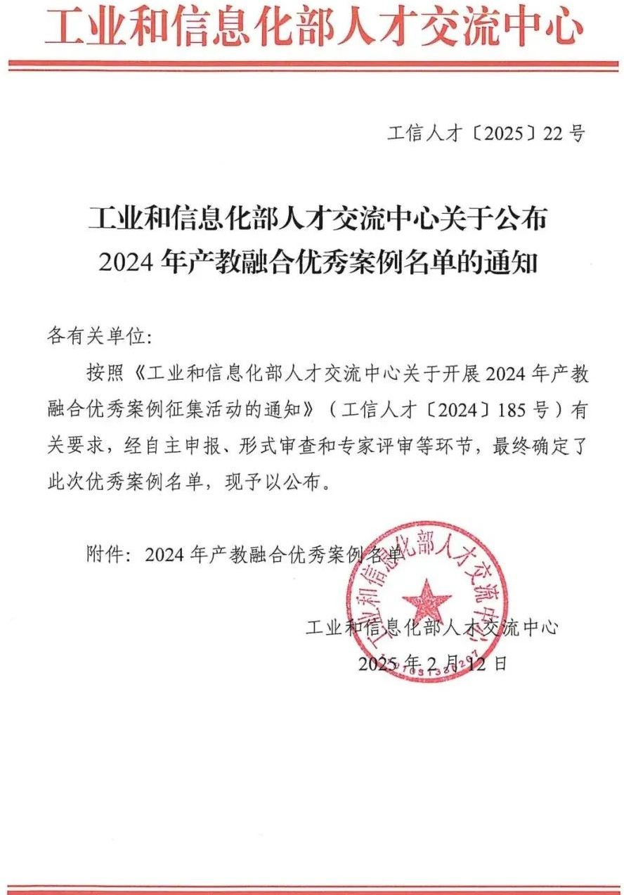 2025年2月12日,工业和信息化部人才交流中心正式公布《2024年产教融合优秀案例名单》,机电学院与合作办联合申报的案例《智能制造产教融合中心的实践探索——构建多功能校企协同平台的经验与成效》,荣获“三等优秀案例”。本次评选由工业和信息化部人才交流中心主办,历经自主申报、形式审查、专家评审等多环节筛选,最终确定了60个全国优秀案例。beat365官网凭借智能制造领域的创新实践,成为天津市唯一入选高职院校。
