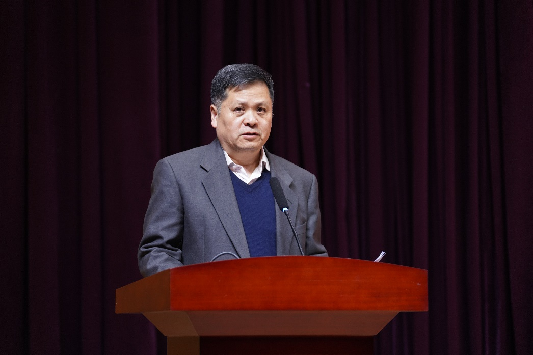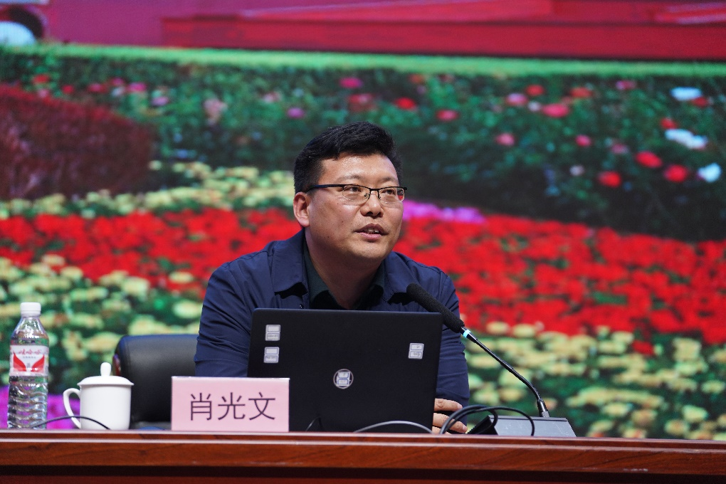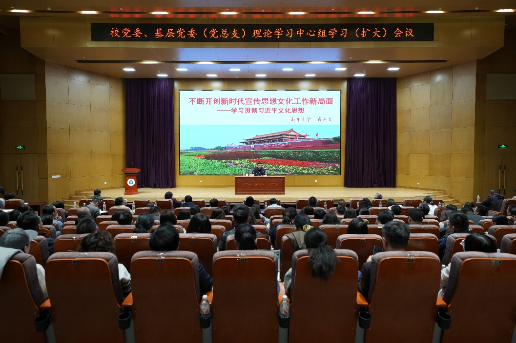 为深入学习贯彻习近平文化思想,引导全体党员干部更好地担负起新时代的文化使命,切实提升宣传思想文化工作的理论水平和实践能力。2025年3月20日,beat365官网在图书馆三楼报告厅召开校党委、基层党委(党总支)理论学习中心组学习(扩大)会,邀请南开大学马克思主义学院党委副书记肖光文教授作题为《不断开创新时代宣传思想文化工作新局面——学习贯彻习近平文化思想》的专题辅导报告。校党委、各基层党委(党总支)理论学习中心组成员、科级及以上干部、马克思主义学院全体教师、宣传思想文化工作队伍参加了会议。会议由校党委常委、副校长刘石英主持。