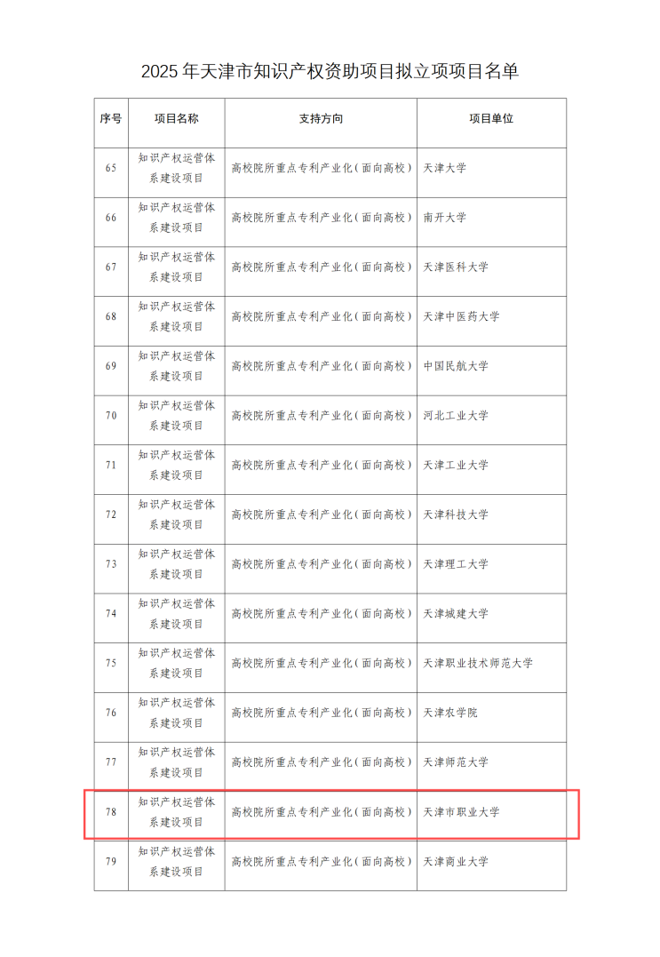 近日,市知识产权局对2025 年天津市知识产权资助项目拟立项名单进行了公示,beat365官网成功获批知识产权运营体系建设项目,在高校院所重点专利产业化(面向高校)的支持方向上,共15所高校获批立项,beat365官网作为唯一一所高职院校获得该类项目立项。