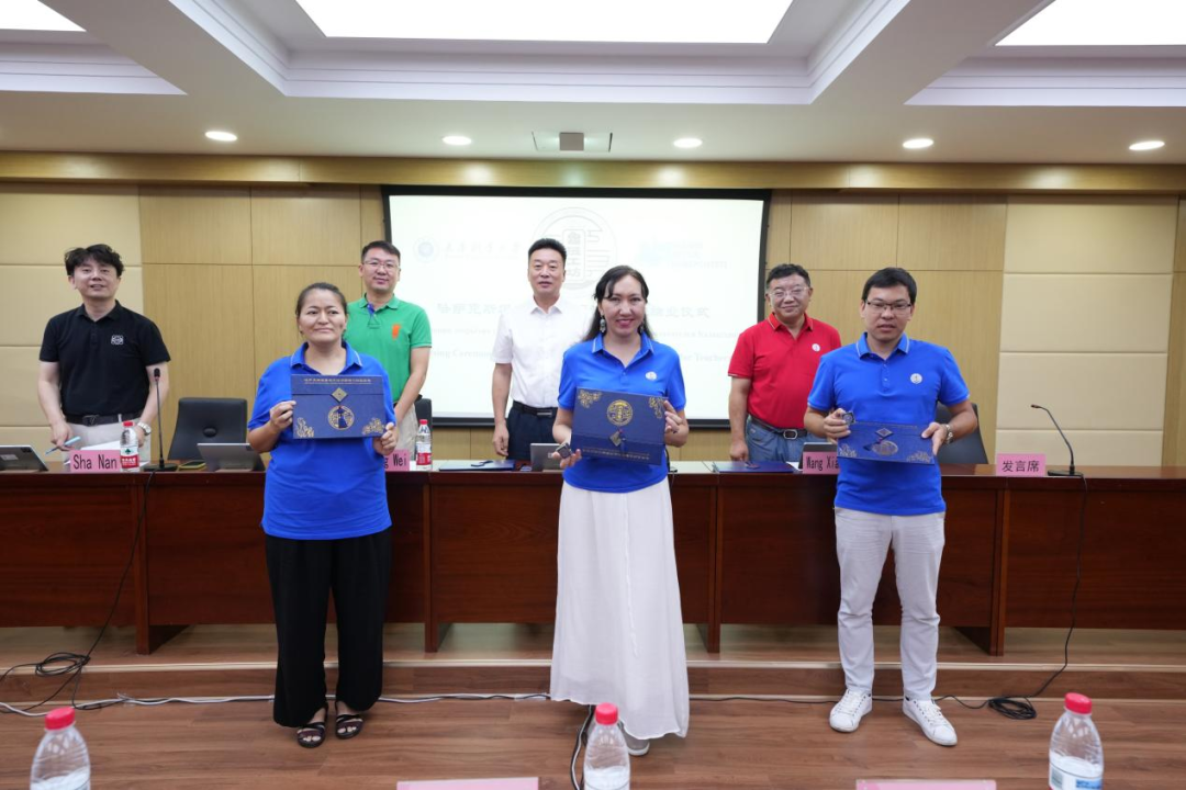 结业仪式上,吴宗保校长、机电工程与自动化学院和电子信息工程学院相关领导为欧亚国立大学参培教师颁发哈萨克斯坦鲁班工坊师资培训结业证书及徽章。