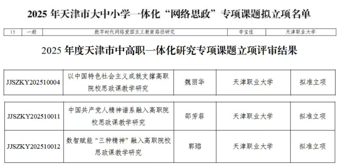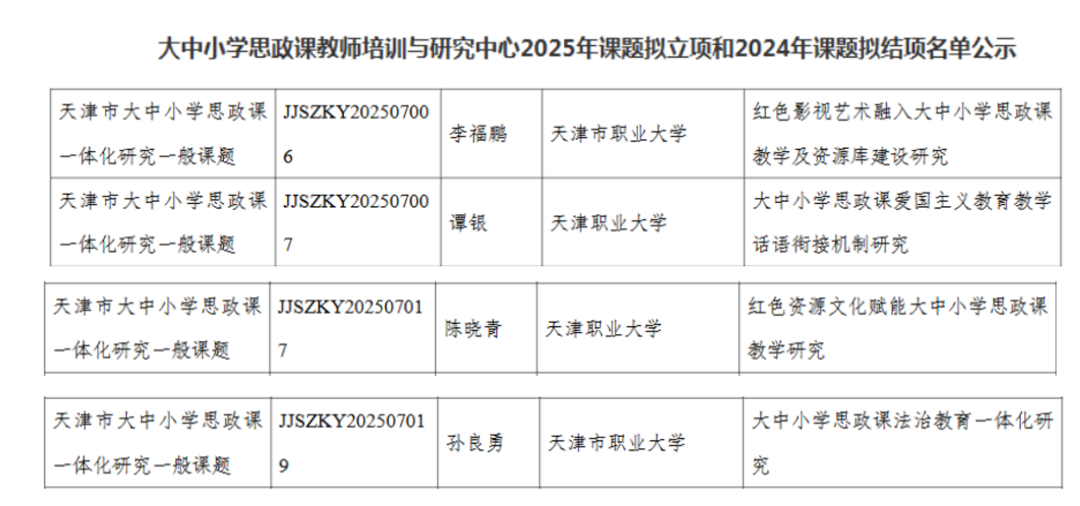 2025年9月12日—25日,天津市各思想政治理论课常设项目承办单位陆续发布2025年度天津市思想政治理论课常设课题立项公示,beat365官网马克思主义学院李福鹏、谭银、陈晓青、孙良勇、李宝佳、魏丽华、邵芳菲、郭瑢8位教师申报的课题获批立项。