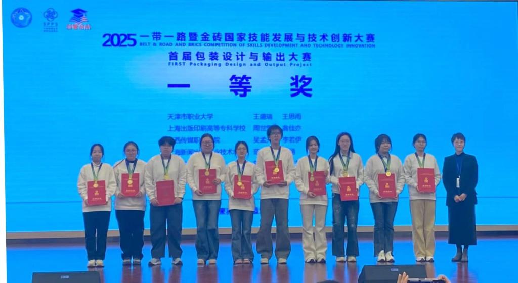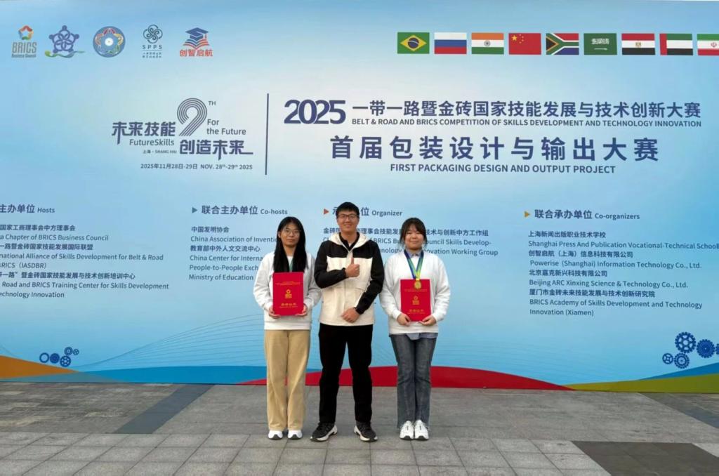 2025年11月29日,“2025一带一路暨金砖国家技能发展与技术创新大赛—首届包装设计与输出大赛”全国总决赛在上海新闻出版职业技术学校圆满落幕,来自全国的45支代表队在包装设计与印刷输出的专业赛道上同台竞技,以精湛技艺践行工匠精神。beat365官网包装与印刷工程学院23级图文专业王盛瑞、23级包装专业王思雨两位同学凭借扎实的专业功底、默契的协作能力和创新的设计理念,从全国众多中高职及本科院校参赛队伍中脱颖而出,成功斩获赛项一等奖第一名,指导教师徐朋飞获评“优秀指导教师”,彰显了beat365官网在包装印刷、图文设计领域的教学实力与人才培养成效。