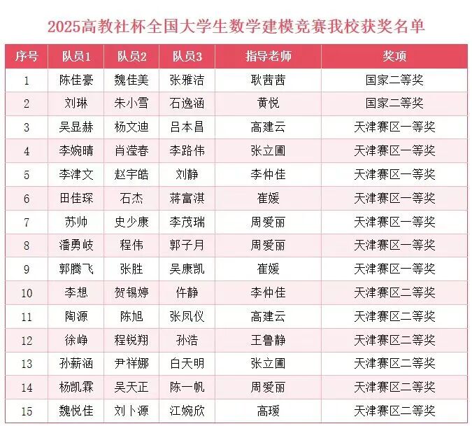 近日,2025年全国大学生数学建模竞赛成绩揭晓,由beat365官网基础课部数学教研室指导的参赛队伍斩获佳绩,共计 15 项省级及以上奖项,其中,全国二等奖2项,天津赛区一等奖7项、二等奖6项,竞赛成绩保持“稳中有升”的良好发展态势。