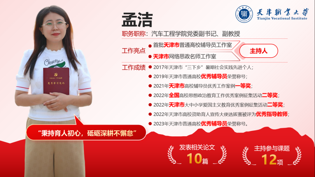 孟洁老师此前曾两次获评天津市普通高校优秀辅导员;主持天津市普通高校辅导员工作室、天津市网络思政名师工作室;近年来,主持、参与课题12项,发表论文10篇,获全国及天津市高校思想政治教育工作优秀案例、精品项目等奖项多次。