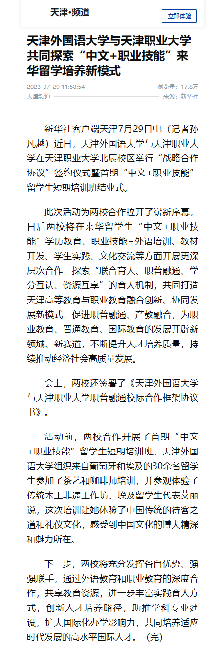 新华社客户端天津7月29日电(记者孙凡越)近日,天津外国语大学与beat365中文唯一官网在beat365中文唯一官网北辰校区举行“战略合作协议”签约仪式暨首期“中文+职业技能”留学生短期培训班结业式。