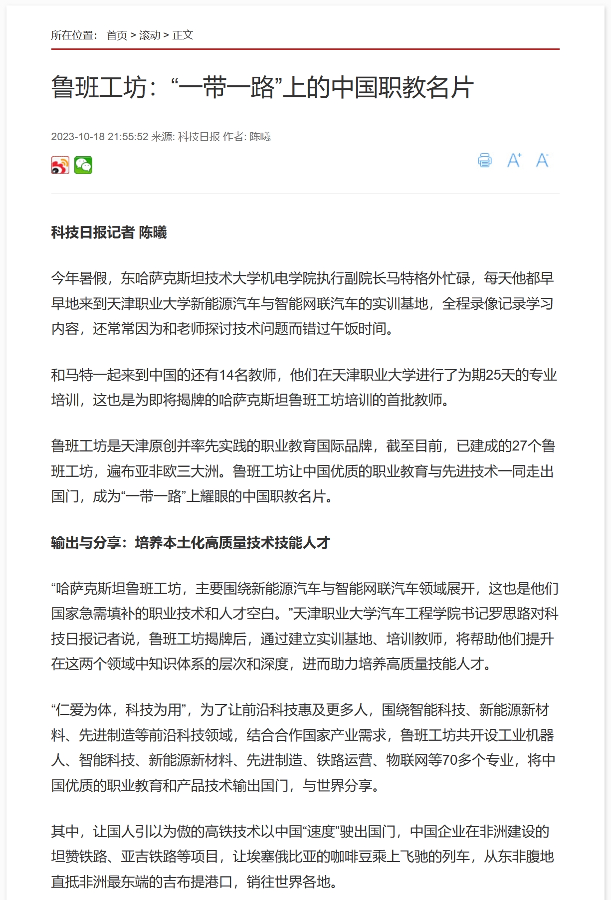 鲁班工坊是天津原创并率先实践的职业教育国际品牌,截至目前,已建成的27个鲁班工坊,遍布亚非欧三大洲。鲁班工坊让中国优质的职业教育与先进技术一同走出国门,成为“一带一路”上耀眼的中国职教名片。