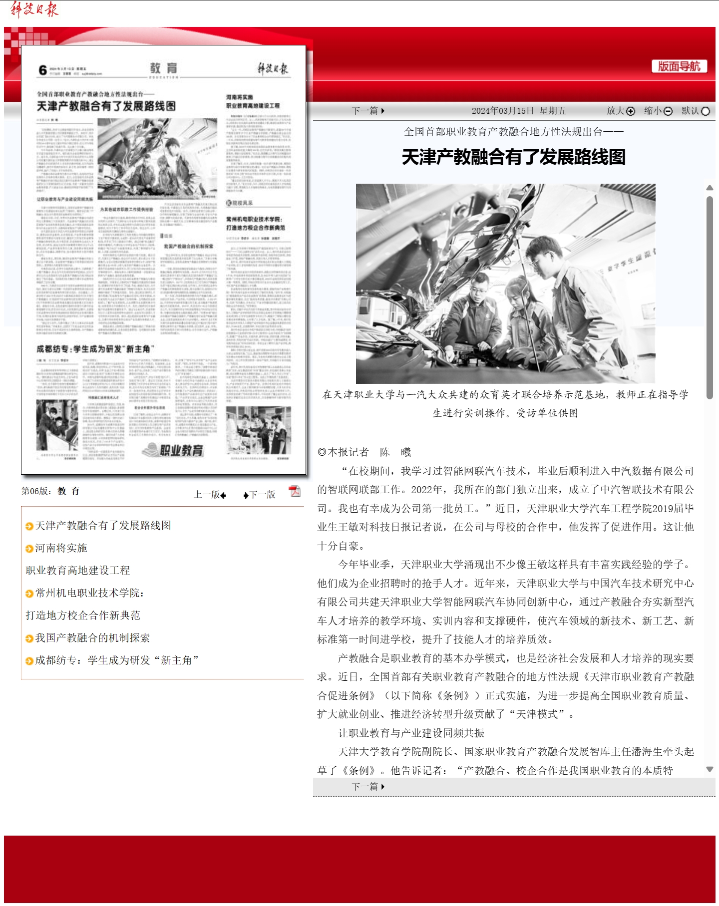 类似的案例在天津的职业院校中数不胜数。截至目前,天津市以产教融合、校企合作为依托,累计成立31个职教集团,全国示范性职教集团培育单位增至6个;培育产教融合型企业193家,2家入选国家产教融合企业名单。天津多所职业院校与包括华为、西门子在内的4000余家企业开展深度合作。潘海生表示,《条例》能够进一步促进职业教育与产业融合,提高职业教育质量。